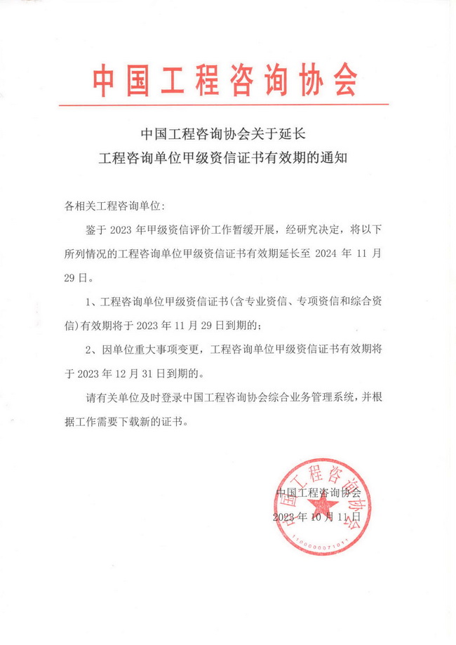 中國工程咨詢協(xié)會關(guān)于延長工程咨詢單位甲級資信證書有效期的通知