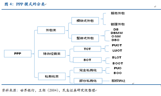 從廣義上來說,PPP指的是企業(yè)參與提供傳統(tǒng)上由政府獨自提供的公共產(chǎn)品或服務(wù)的模式。從世界銀行對PPP的分類來看,主要包括外包類、特許經(jīng)營類和私有化類。因此,BOT本質(zhì)上也可視為是PPP的一種。 ![]()