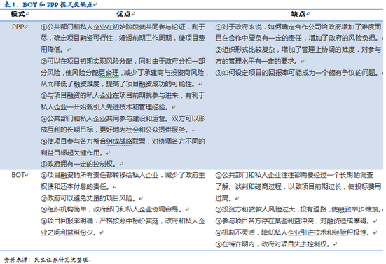 但從合作關(guān)系而言,BOT中政府與企業(yè)更多是垂直關(guān)系,即政府授權(quán)私企獨立建造和經(jīng)營設(shè)施,而不是與政府合作,PPP通過共同出資特殊目的公司更強調(diào)政府與私企利益共享和風(fēng)險分擔(dān)。 PPP的優(yōu)點在于政府能夠分擔(dān)投資風(fēng)險,能夠降低融資難度,雙方合作也能夠協(xié)調(diào)不同利益主體的不同目標(biāo),形成社會利益最大化,但缺點在于增加了政府潛在的債務(wù)負擔(dān)。BOT優(yōu)點在于政府最大可能的避免了項目的投資損失,缺點是投資風(fēng)險大,私營資本可能望而卻步,且不同利益主體的利益不同,單方面利益最大化的納什均衡并非全社會最優(yōu)。 ![]()